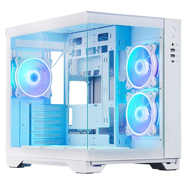 Hvidt dual‑chamber chassis med front‑ og sidepanel i glas og avancerede kølemuligheder